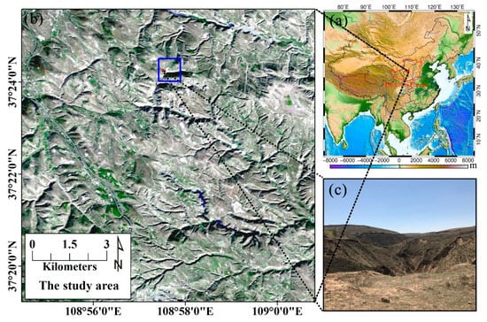 The study area, which belongs to the middle part of the Loess Plateau shown in Figure 1a, is located in Jingbian County, Shaanxi Province, China, with a central latitude of 37°22′N and a central longitude of 108°58′E. The region has a surface of about 110 km2 and is characterized by rugged terrain and complicated gullies with elevation varying from 1200 m and 1700 m. In addition, the region provides a representative of the typical semi-arid circumstance with 455.76 mm/a precipitation and 1510.14 mm/a potential evapotranspiration, as shown in Table 1. The above-mentioned situations result in the land type mostly manifesting as sparse meadows and bare land, as shown in Figure 1b. Figure 1c shows the scenery of the region where bare land becomes the leading land type during the dry season from October to May (the following year), largely because of the continental monsoon climate.