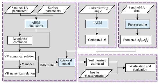 As one of the analytical physical models that are most widely used, AIEM is employed for simulating the radar backscattering coefficients at various surface parameters over the study area. Considering that the AIEM had limited capability for dealing with the effect of complex topography, we proposed an improved retrieval approach to estimate soil moisture using Sentinel-1A radar data. The primary innovation of this approach is to append IACM into the preliminary retrieval model established by the simulation database, which efficiently mitigates the impacts from topographic factors. The process flow of soil moisture estimation is presented in Figure 4, and the detailed descriptions are introduced in the following sections.