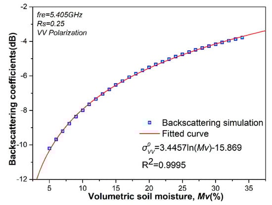Backscattering coefficient (dB) simulation in the VV polarization at 30° incidence with 0.25 , presented using blue blocks. The red line represents the fitted curve.