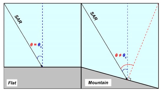 Diagram of the local incidence angle in flat and mountain areas. The red angle represents the local incidence angle , and the blue angle indicates the radar viewing angle .