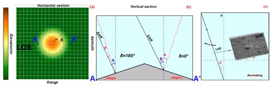 where is the radar viewing angle; slope represents the slope angle at the scatterer location, extracted from the AW3D DSM product; is the angle between the ground scatterer and the line of sight (LOS) as shown in Figure 8a, calculated as []: