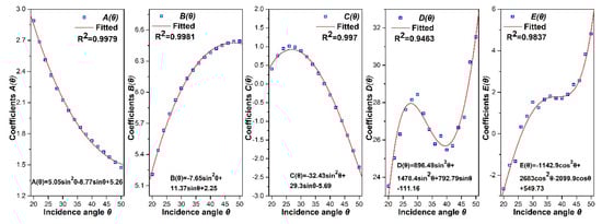 In the soil moisture retrieval model, expressed in Equation (12), there are still several coefficients of variables that need a definite numerical model for quantitative calculation, rather than only the notional expressions. Therefore, to observe the numerical relations between coefficients, i.e., , and the incidence angle , a large number of simulated backscattering coefficients based on AIEM were involved in the regression analysis and numerical modeling. The resultant numerical relations are presented in Figure 9, showing the response of the incidence angle to the function coefficients: , , , , , and the fitted curve.