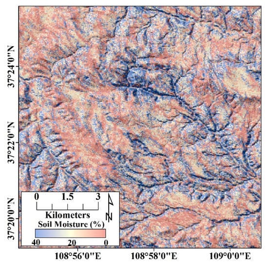 After the backscattering coefficients were extracted from SAR images and the local incidence angles were inverted, the estimation of soil moisture status over complex terrain land was computed based on the retrieval model given in Section 3.2. The map of volumetric soil moisture overlaying hillshade graph derived from AW3D30 product is shown in Figure 11, which reveals that land with volumetric soil moisture between 0% and 20% is predominant, mostly distributed in the Loess tableland, ridge and hills. Due to the regional dry climate and the strong differentia between evaporation and precipitation, soil moisture in such areas is low. Particularly in the Loess tableland with high topography and few vegetation, the soil moisture is between 0% and 10%. In the Loess gully areas formed by the Loess erosion, soil moisture is higher with volumetric content between 20% and 40%, largely because of surface water migration via seepage.