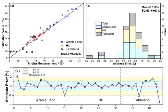 Accuracy evaluation of the estimated results: (a) the comparison between the estimation value and the in situ measurement; (b) the statistical analysis of the absolute errors of soil moisture estimation; (c) the absolute errors of soil moisture estimation in each in situ site with different topographical conditions.