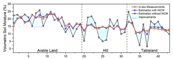 To address this problem, this paper proposed a model, called IACM, for calculating the local incidence angle, thereby enhancing the estimation accuracy. To evaluate the performance of IACM, the volumetric soil moisture was repeatedly estimated under the same conditions except using IACM for the local incidence angle retrieval. The results evidence that coupling IACM and AIEM for soil moisture estimation in gully fields is much more efficient than only AIEM employed (Figure 13). The SDAE of estimation without IACM is 4.82%, which is 500% larger than that with IACM corrected (0.957%). Correspondingly, the RMSE of estimation without IACM is 4.83%, compared to 0.963% with IACM. As shown in Figure 13, soil moisture estimation over hill areas, which have the most complex terrain of the three topographical conditions, receives the most significant improvements with IACM. Therefore, taking advantage of IACM to retrieve local incidence angle can expand application of quantitative estimation based on microwave backscattering model to the fields with complex terrain.