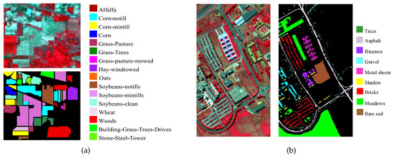 Sample image and corresponding ground truth map. (a) Indian Pines data set. (b) Pavia University data set.