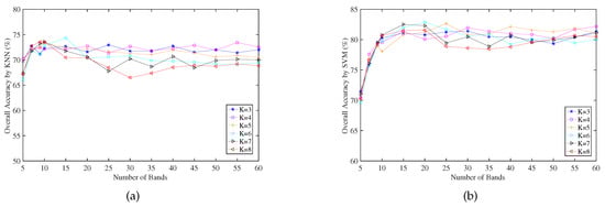 OA for parameters K by selecting different number of bands on Indian Pines data set. (a) and (b) OA by KNN and SVM classifiers, respectively.