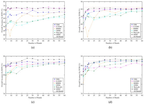 OA for several band selection methods by selecting different number of bands on two data sets. (a,b) OA by KNN and SVM on Indian Pines data set, respectively. (c,d) OA by KNN and SVM on Pavia University data set, respectively.