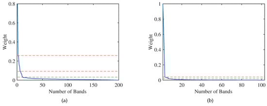 Band weight curve. (a) Band weight curve on Indian Pines data set. (b) Band weight curve on Pavia University data set.