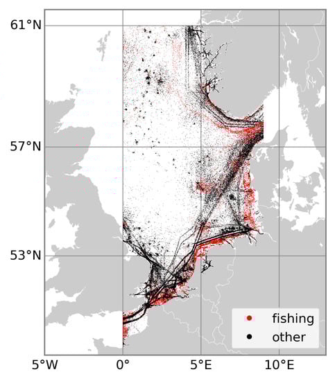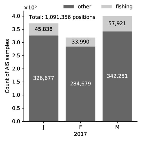 The AIS data cover the first three months of 2017. This dataset is from AIS messages recorded via satellites. The sampling frequency of the recording is about one hour for each vessel. Figure 3 shows that there is a total of more than 1 million AIS samples, with fishing vessels only accounting for a small portion (12.6%) of the AIS data in the study area. Figure 4 shows the spatial distribution of the fishing and non-fishing vessels, which forms the basis of our approach. Overall, fishing vessels tend to operate in areas away from other vessels. The geographical extent of the AIS data is larger than that of the S-1 data (Figure 2) to avoid any edge effects. In addition to the vessel’s geographical position and its type, AIS messages also include information such as length, width, satellite time stamp, Maritime Mobile Service Identity, flag, etc. As explained in the next section, our approach relies only on AIS information which is also available from the SUMO detector.