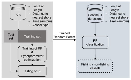 Figure 5 summarizes our two-step approach. First, the RF classifier is trained and tested on the AIS dataset. The classifier differentiates fishing and non-fishing vessels based on their longitude, latitude, length, distance to nearest shore, and the time of the measurement. Once trained and tested, the RF is applied to the S-1 detections returned by SUMO to isolate the fishing vessels.