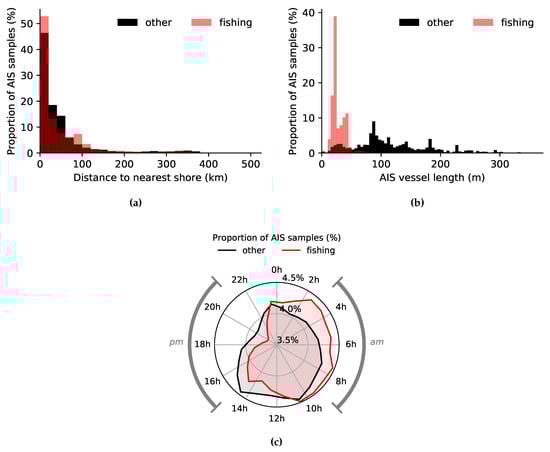 Distribution of (a) the distance to nearest shore, (b) the length, and (c) the time of the day for all the fishing (red) and non-fishing (other; black) samples of the AIS data. For (c), only the samples within the am and pm segments are used for training. The total number of fishing and non-fishing samples are 137,749 and 953,607, respectively.