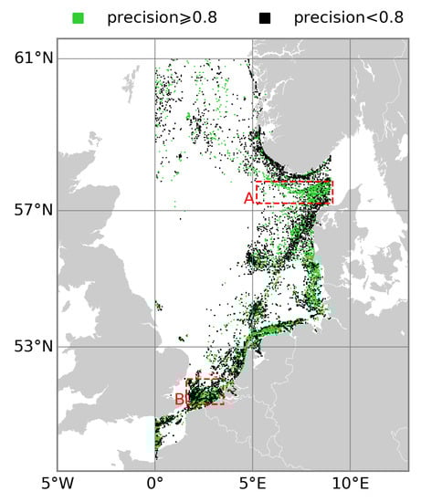 Further to this, Figure 8 shows that there are regions (rectangle A) of the study area where the classification precision for the fishing class is high (). Low precision (rectangle B) occurs in areas where the non-fishing class dominates, and where the input features may not enable the discrimination of the two classes (fishing and non-fishing vessels in similar location, with similar length, etc.). It follows that special care must be taken if the classifier is applied to a single vessel at a given location. The chance of the classifier to be right about that single vessel is reflected by the performance of the classifier at that specific location.