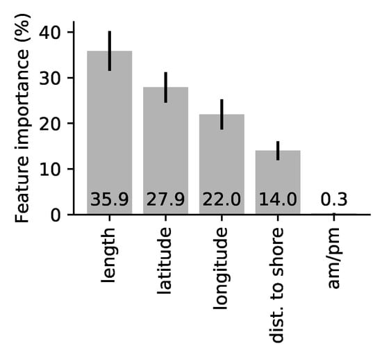 Figure 9 shows that the vessel length is the most important input feature in the classification, even after simplifying the length information into the small, medium, and large categories. The latitude is more important than the longitude because the study area spans more latitudes than longitudes, thus latitude discriminates more vessels. The distance to nearest shore is also useful in the classification. In comparison, the am/pm feature has a negligible importance and could be removed from the classifier.