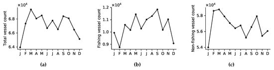 We then compute the monthly vessel count (Figure 11), with correction presented in Section 3.3. The total vessel count (Figure 11a) is overall constant throughout the year with exception of January and December where there are fewer vessels. The fishing-vessel count (Figure 11b) gradually increases from January to September, then decreases from September to December. Finally, the non-fishing-vessel count (Figure 11c) increases between January and February, then gradually decreases from February to December. From the confusion matrix in Table 4a, one may expect the temporal variation in non-fishing vessels to be similar to that of the fishing vessels because of many samples being wrongly classified as fishing vessels. In practice, the variation in the two vessel classes are significantly different, possibly because the number of samples wrongly classified as fishing vessels remains stable over time.