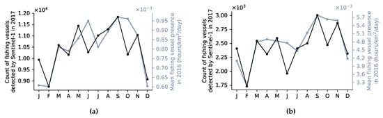 To go further, we compare our fishing-vessel count to Global Fishing Watch (GFW) data on fishing-vessel presence, available daily from January 2012 to January 2017 at 0.01 deg resolution [24]. GFW identified 6 fishing and 6 non-fishing-vessel classes with an accuracy of 95%, by applying a CNN classifier to vessel trajectories extracted from AIS data (see [25] for more details). We summed the vessel presence across the fishing classes, then computed the monthly mean over our study area for 2016. Although our data and the GFW data are for different years, there is a reasonable agreement between our fishing-vessel count and the mean fishing-vessel presence (Figure 12a). Both data suggest a peak in fishing-vessel activity around September, while December, January, and February are the less active months. In Figure 12b, we restrict the comparison to the area where the classification precision for the fishing class is above 0.8 (green area in Figure 8). The agreement between the two datasets does not improve, possibly because there are too few samples to perform a reliable comparison.