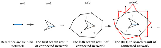 The identification of the largest connected network is an iteration process. We start with one reference arc in the largest connected network as the initial network. The iteration involves the step of enlarging the network by adding SPS arcs directly connected with the current network. The iteration ends until no directly connected SPS arcs can be found. The searching process is demonstrated in Figure 3.
