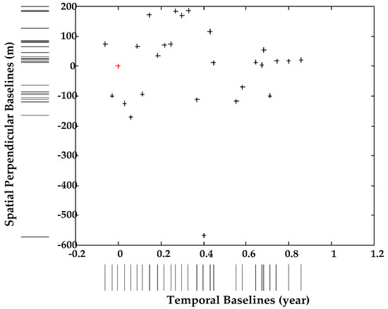 Distribution of the temporal baselines and spatial perpendicular baselines.