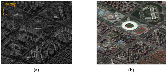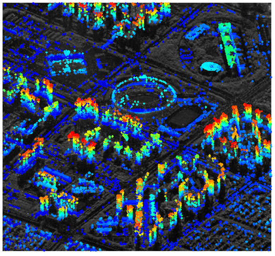 In Figure 12, we display 25% of the total PSs detected in the novel two-tier network and visualize them in the mean calibrated SAR intensity image. The 3D distribution of the urban area, including the gymnasium, district government, and residential buildings, can be clearly seen. Such dense TomoSAR point clouds can be further utilized for reconstructing dynamic city models. Overall, the effectiveness of the new approaches for robust and efficient detection of PSs in SAR tomography was verified by this experiment.
