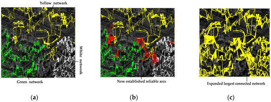 The process of establishing the largest connected network. (a) The main isolated networks after network adjustment; (b) establishing reliable arcs among the main isolated networks; (c) the expanded largest connected network.