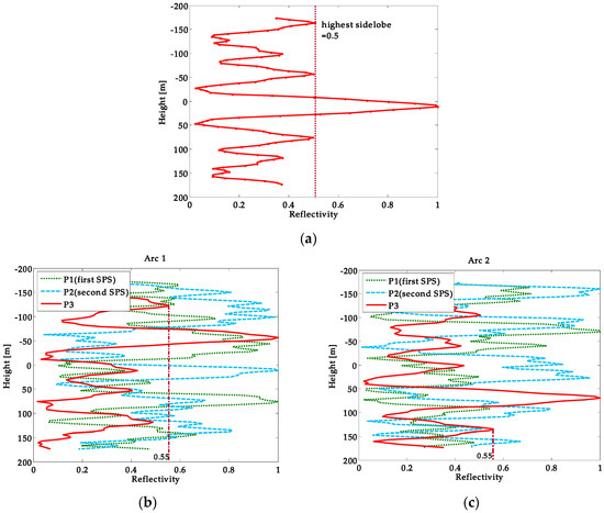 In addition, in order to intuitively show the effectiveness of APS calibration in the first-tier network, we randomly chose two reliable SPS arcs in the largest connected network as an example. We could judge whether the APS was effectively calibrated by the focusing condition of the reconstructed reflectivity profile. Figure 9a manifests the reflectivity profile of ideal measurements with the same baseline distribution shown in Figure 4 and without error interference for an SPS point with . The high sidelobes were caused by the nonuniform distribution of spatial perpendicular baselines. Figure 9b,c show the reflectivity profiles of the two reliable SPS arcs, including SPS pairs. P1 and P2 show that the measurements of the two connected SPSs of arc 1 or arc 2 could not be focused because the measurements were severely influenced by large-scale APS. In contrast, P3 shows that the relative measurements of arc 1 or arc 2 with APS calibrated could be focused, which had approximately identical level of highest sidelobe as that in Figure 8a. This indicated that the APS was effectively calibrated to a small scale in the first-tier network.