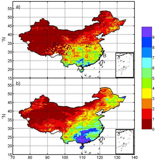 Mean daily precipitation (mm/day) over China for May to September in 2017 from (a) CMPA and (b) GPM-IMERG-EARLY. The four letters in (a) indicate the 0.5° boxes for which the monthly precipitation time series are shown in Figure 5.