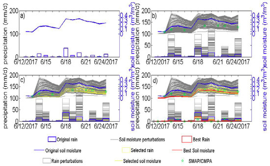 (4) Based on the total of 100 RMSE values, only the best 10 simulations are selected. The retrieval accumulation product (soil moisture corrected products, SMP hereafter) is computed as the mean value of the 10 best simulations (average of 10 perturbed precipitation time series). Note that Román-Cascón et al. consider the quality of SMOS observations in the assimilation based on the quality indices. However, we do not have such indices with SMAP observations [38]. Ideally, evaluations on the quality of satellite-based soil moisture require in-situ measurement. As in situ soil moisture data are not available in many areas in the world, the quality-based assimilation of satellite soil moisture is of limited applicability. Therefore, in this study we follow the simple strategy used in Luca Brocca et al. [28], and always select the same number of simulations in the assimilation process without considering the quality of satellite-based soil moisture observations. This simple strategy facilitates broader applications. In the example shown in Figure 2, the SM (yellow lines in Figure 2c) associated with the rainfall time series (yellow bars in Figure 2c) are averaged (red bar in Figure 2d) to provide a corrected rainfall estimate. The red line in Figure 2d represents the corrected soil moisture associated with the corrected rainfall by the API model, and the last value will be used to initialize the next simulated period. The initial value of SM on each grid cell in the API model was derived from a 30-year spinup of the model. While a 30-year spinup is used in this study, the simulation gets into an equilibrium states within one years.