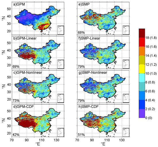 For RMSE, GPM has a wide range with the median of 5.25 mm/day, as shown in Table 2. All correction methods change RMSE, and the SMP-Linear method performs best of the seven methods. The RMSE values of GPM are less than 4 mm/day in most areas of western China, and exceed 10 mm/day in most areas of eastern China, as shown in Figure 3a. This regional contrast may result from differences in the magnitude of annual total rainfall between western and eastern China. Figure 1 and Figure 3a share a similar spatial pattern, indicating that RMSE tends to increase with precipitation. Figure 3b–h clearly demonstrate areas of performance resulting from the seven different correction methods. The SM corrected algorithm leads to substantial improvements in southeast China, eastern coastal areas and the corner of the northwest region. The RMSE values are decreased by more than 20% in most of the southeast and east coast, and this decrease is up to 60% in some regions. The results are mixed in the northeast, where the RMSE values are decreased by 20–60% in some areas and increased by up to 80% in other areas. SMP is less effective elsewhere, especially in the northwest. Applying the linear or nonlinear fitting correction to GPM leads to spatially more extensive improvement compared with SMP. However, the median of RMSE for the linear (5.04 mm/day) or nonlinear (4.64 mm/day) correction are larger than that for SMP (4.32 mm/day). The corrections by SM, linear, and nonlinear methods improve GPM in most areas in eastern China, whereas they degrade GPM in many areas of western China, as shown in Figure 3b–e. Combining the linear or nonlinear fitting corrections with the SM correction results in greater improvement than SM, linear, or nonlinear fitting correction alone in most areas of China, especially in western China, as shown in Figure 3f,g. In addition, the percentage of grid cells with improvement is the largest (79%) with the SMP-Linear or SMP-Nonlinear method, which is consistent with the smaller value of the RMSE median for the two methods. The SMP-Linear method slightly outperforms the SMP-Nonlinear method, with the smallest value of RMSE median (4.00 mm/day) and the narrowest range (0.67 mm/day for 10th percentile, and 10.40 mm/day for 90th percentile). By contrast, the GPM-CDF and SMP-CDF perform worse than GPM in most areas of Western China and some regions of Southern and Central China, with larger RMSE medians than the GPM.