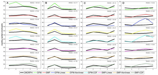 Time series of monthly rainfall in May to September of 2017 obtained from CMPA, GPM, and the seven corrected products (SMP, GPM-Linear, GPM-Nonlinear, GPM-CDF, SMP-Linear, SMP-Nonlinear, and SMP-CDF) for the four boxes A, B, C and D shown in Figure 1. RMSE: root-mean-square error in mm/month.
