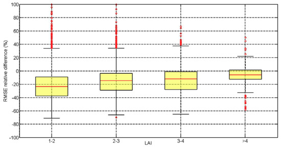 Box plot of relative difference in RMSE (%) between SMP and GPM (defined as 100%×(SMP-GPM)/GPM) with different ranges of LAI values.