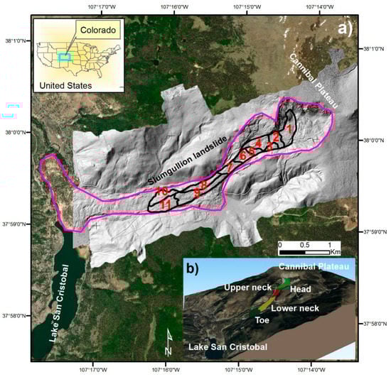 - Fleming, R.; Baum, R.L.; Giardino, M. Map and Description of the Active Part of the Slumgullion Landslide, Hinsdale County, Colorado; U.S. Geological Survey: Reston, VA, USA, 1999.