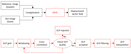 Flow diagram of the implemented methodology. The upper part of the picture shows the general processing chain, while in the lower part the flux represents an exploded view of the Sub-Pixel Offset Tracking (SPOT) processing block.