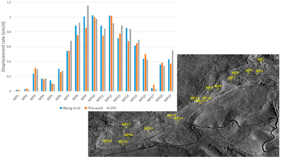 In the following, the obtained results will be discussed at a finer scale exploiting data concerning 19 measurement points (MPs) installed on the landslide by the US Geological Survey (USGS) [34]. Reference data for comparison were extracted from Reference [26], in which the kinematics of the landslide was analyzed in the time frame August 2011–April 2012 using airborne L-band remote sensing and was compared with GPS data collected at the USGS MPs. Note that these data were reproduced through graph digitalization, and it is therefore possible that they exhibit (negligible) differences with respect to their original version.
