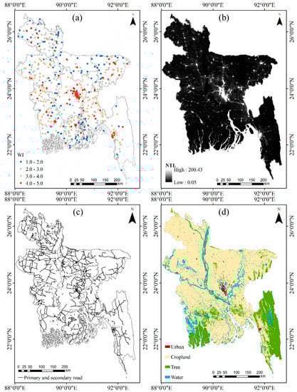 Maps illustrating the primary and secondary roads (Figure 2c) acquired from Open Street Map (OSM) [49] were used to calculate the accessibility of the region. Land cover maps at a 300-m resolution for 2015, acquired from the European Space Agency (ESA) Climate Change Initiative (CCI) project [50], were used to extract urban area as well as other land cover features. We integrated land cover types into four categories: urban, cropland, tree, and water (Figure 2d). The Administrative boundary and division headquarter data (Figure 1) were obtained from a geo-spatial data storing and sharing website provided by Bangladesh government [51].