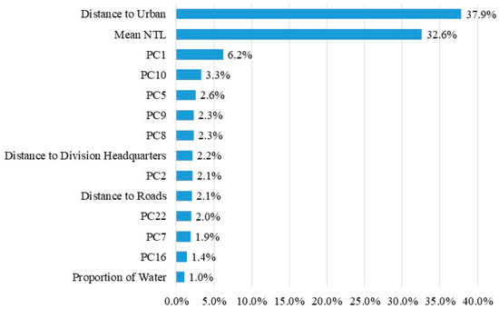 Selected variables ordered by Gini importance are shown in Figure 4. It shows that 14 out of the 36 variables were selected, with distance to urban being the most important variable with an importance weight of 37.9%. Amongst the four types of variable sets, accessibility variables (including distance to urban, distance to roads, and distance to division headquarters) were the most important variables with a total importance weight of 42.2%, indicating that accessibility was the key factor to estimate poverty level. On the other hand, 9 out of the 25 structure and texture variables extract from Google satellite images were selected (including PC1, PC10, PC5, PC8, PC9, PC2, PC7, PC22, and PC16) with a collective importance weightage of 24.1%. The mean NTL was the only socioeconomic variable that was retained with an importance weight of 32.6%, whereas the proportion of water was the only land cover variable that was retained with a marginal importance weight of 1.0%.