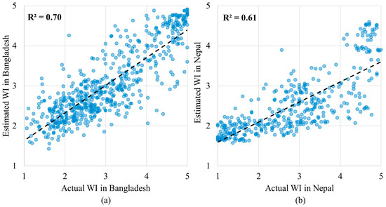Scatter plot between the actual WI and the estimated WI in (a) Bangladesh and (b) Nepal.