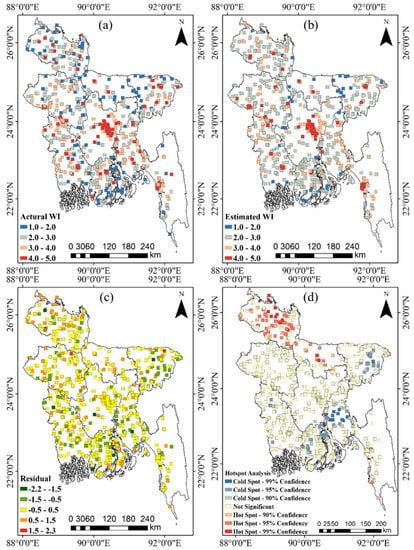 The comparison between actual and estimated WI in Bangladesh. (a) Actual WI; (b) estimated WI; (c) residual between the actual and estimated WI; and (d) hotspot analysis of the residuals.