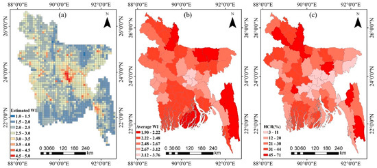 Using the RFR model, we reconstructed the 10 km × 10 km poverty map for the whole of Bangladesh (Figure 7a). Areas where the model assigns a low WI were colored blue, while areas assigned a high WI were colored red. We aggregated the estimated WI to the district level by calculating the average WI value of all grids in each district (Figure 7b). As a validity check, we compared the aggregated WI against the most recent poverty Head Count Rate (HCR) map (Figure 7c), which was derived based on the 2015 survey data [63]. Both the WI map and poverty HCR map were classified into five grades using the Jenks natural breaks [64] classification method. The patterns shown in these two maps are largely similar.