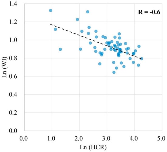 Furthermore, we calculated the Pearson correlation coefficient (r) between the log-transformed poverty HCR and estimated WI. The log transformation was applied to decrease the variability of data and make the data conform more closely to a normal distribution. The r of −0.60 (p < 0.001) indicates a negative correlation between the log-scaled poverty HCR and WI (Figure 8).