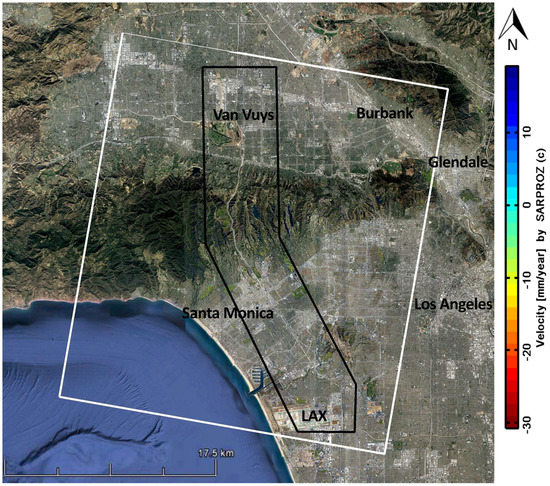 Land deformation measurement by PSInSAR needs sufficient number of SAR images. From literature [67,68], the PS analysis requires at least 20 to 25 SAR images to achieve reliable outputs. Considering this important condition on number of images, we collected 29 descending Sentinel-1A SAR images acquired over the study area during June 2017 and May 2018. After collecting the raw data, we defined the study area with an area of 1019 km2 to cover the corridor and its neighborhoods. Figure 1 displays the study area. The white line indicates the master area and the black line shows the boundary of the study area of Sepulveda Transit Corridor.