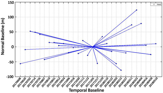 Figure 2 displays the SLC data used in this study and the spatiotemporal baseline configuration of interferometric pairs. To form the interferograms, all images were connected with the master image (5 December 2017). The master image is chosen at the barycenter of the temporal baseline, x-axis, and normal baseline, y-axis, distributions. The dots and lines represent the images and the interferograms, respectively.
