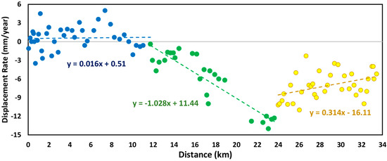 Figure 6 shows the variations in displacement rates (average) along the corridor from south (0 m) to north (34,000 m). In order to estimate the displacement rates in an arbitrary point through the corridor, we proposed a function as Equation (4) derived from the available deformation rates in the location of PS points. Such categorizations can help the designers and decision makers of the project to detect the places, which require solutions to control the probable asymmetric subsidence along the corridor. The asymmetric subsidence is fully explained in Section 4.5.