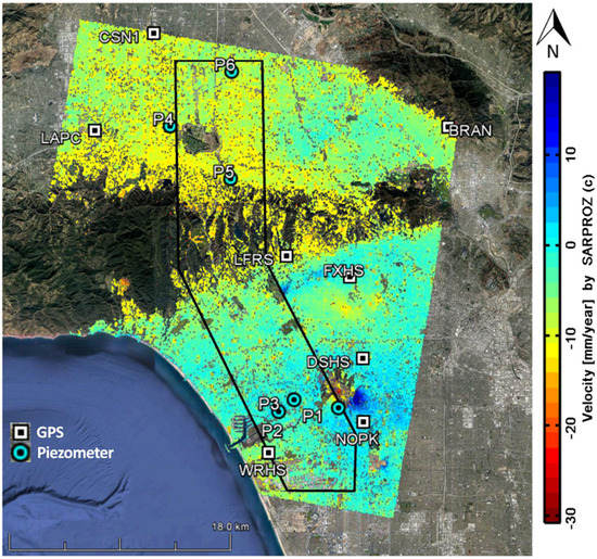 A number of studies have used geodetic and InSAR techniques to evaluate the ground deformation in Los Angeles Basin. For example, the radar data acquired by the European Remote Sensing Satellites (ERS-1 and ERS-2) from 1992 to 1999 were analyzed [51] using InSAR to study the ground deformations along the southern San Andreas fault system. In addition, the interseismic crustal movement was measured [52] near Los Angeles, along the San Andreas Fault (SAF), by a new technique for integrating InSAR analysis on ERS descending and ALOS ascending radar images, and GPS data. The outputs display the vertical velocity of land deformation between −2 to +2 mm/yr, and shows uplift on the SAF in the Los Angeles area. Several researchers investigated the ground displacements related to groundwater level changes and fluid extraction in the Los Angeles Basin. For instance, radar images of ERS-1/2 satellite and GPS data were deployed [29] to infer the seasonal land deformations related to groundwater extraction in the Los Angeles basin. Also, a study on metropolitan Los Angeles [40] evaluated seasonal oscillations of the Santa Ana aquifer (uplift and subsidence), located in Los Angeles Basin, using InSAR technique from 1998 to 1999. The analysis provided estimates of ground displacement in the Line of Sight (LOS) of the European Remote Sensing (ERS) satellite in the time between satellite passes. The InSAR outputs showed uplift and subsidence in metropolitan Los Angeles to in response to extraction of fluid resources.