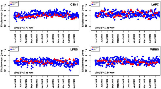 GPS data has high temporal resolution because of continuous measurements while the PSInSAR method provides high spatial resolution and lower temporal resolution compared to data from GPS stations. Thus, the integration of GPS and PSInSAR measurements can be used to interpret the land displacements. In order to evaluate the PSInSAR results in the previous section, GPS data [69] were collected and introduced in Table 1. Eight stations are represented which two of them (DSHS and FXHS) are inactive since 2011. So, we considered six active stations to compare their results with the PSInSAR outputs in their locations and then, two stations (BRAN and NOPK) with more noises and insufficient observations were removed. Figure 8 shows the comparison between PSInSAR-derived time series deformation and the corresponding GPS observations. For this comparison, the RMSE was computed between each PSInSAR output and GPS measurement and demonstrated relatively good agreement between them. Lacking sufficient number of GPS stations is a significant weakness of GPS stations in monitoring the land displacements compared to SAR Interferometry. Also, the fluctuations in GPS results referred to seasonal effects and the instrument inherit errors [69]. These are the main disadvantageous or weaknesses of GPS observations compared to the SAR analysis performed in the present study.