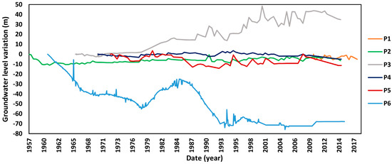 Land surface deformation depends on many factors such as the depth of sediments and the amount of fluid extraction. Therefore, each area may behave differently at different places and different periods. In geotechnical engineering, land subsidence is estimated by considering the following parameters: deformable soil thickness, effective stress variation, and modulus relating the two previous parameters. The changes in the stress state are due to variations in the groundwater level. As the piezometric levels were measured frequently during a period, they are used to determine the groundwater table depth and pore water pressure changes are assumed equal to changes of ground water table [24,60]. Drainage of groundwater in soil deposits can induce huge ground subsidence. Thus, it is imperative to investigate the soil properties of deep geotechnical wells to detect thick compressible sediments particularly in the areas suffering from groundwater extraction.