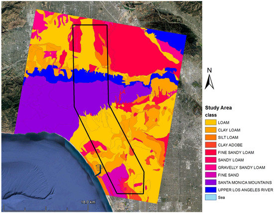 Surface soil map of the study area. The map is created based on raw soil data provided by the Los Angeles County Department of Public Works, Water Resources Division.