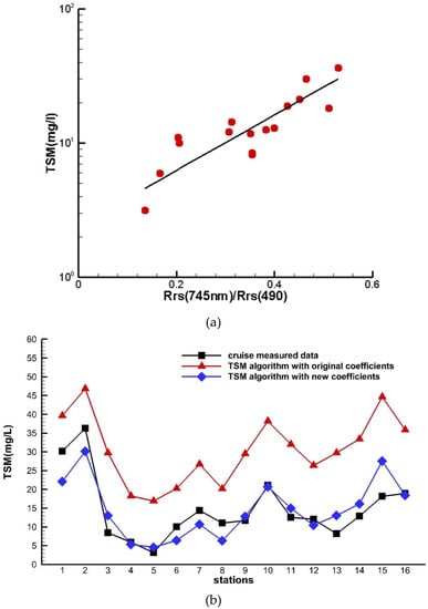where and are two coefficients of the empirical TSM algorithm. In the case of HZB [5], they are 1.0758 and 1.1230 for the East China sea respectively. But due to different water quality and TSM sediments, it is found that there is some bias in Lake Taihu. Therefore, the coefficients are recalibrated by linear regression in a semi-logarithmic scale using the TSM algorithm and our field data, based on the experimental results from our research cruise in July 2017.