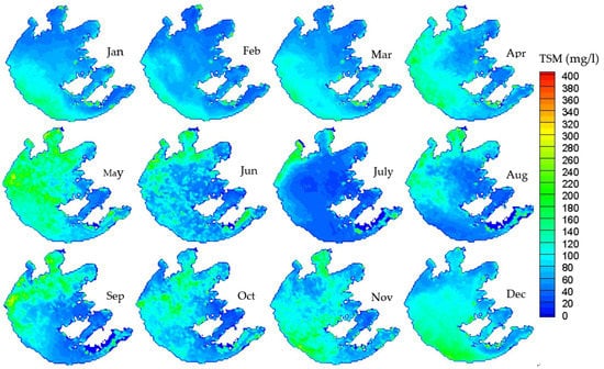 Figure 5 shows the resultant monthly average TSM concentration in Lake Taihu retrieved by GOCI in 2017. Each of these outcomes represents the TSM concentration results averaged from days for a certain month. The color bar on the right indicates that the TSM concentration in Lake Taihu ranges from 0 to 400 mg/l approximately. From the monthly TSM concentration results in the contours, the high TSM region is southwest of the lake and is relatively low from January to March. From February to May, the concentration increases and starts to move towards north. And then it decreases and becomes the lowest in July. From July to December, the concentration increases again and keeps filling the entire Lake Taihu from the north lakeshore.