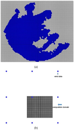 The figures above show that remote sensing is very powerful for long time series TSM data. But to study the short duration process of the TSM movement, simulations need to be done when there are obvious characteristics of wind. Figure 6a shows the computational domain of Lake Taihu. It is a rectangular staggered Cartesian grid and the area fits the water area of Lake Taihu. The size of the computational domain is 82 km by 69 km. A grid size of ∆x=∆y=923.5 m is used based on the resolution of GOCI data. The information of sediment particle is collected from experiment [4]. The particle size is 18 and density is 1.5 103 . The main source TSM is from initial input and resuspension. From our experiment in this paper, most of it is inorganic. Figure 6b shows the relative location of the computation domain and wind velocity data from ECMWF. The blue points are the locations of the wind data from ECMWF and the values are projected to the computational grid points using bilinear interpolation.