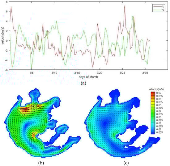 (a) Average wind velocity components above Lake Taihu in March and (b) water velocity contour and vector after 5 days and (c) 8 days.